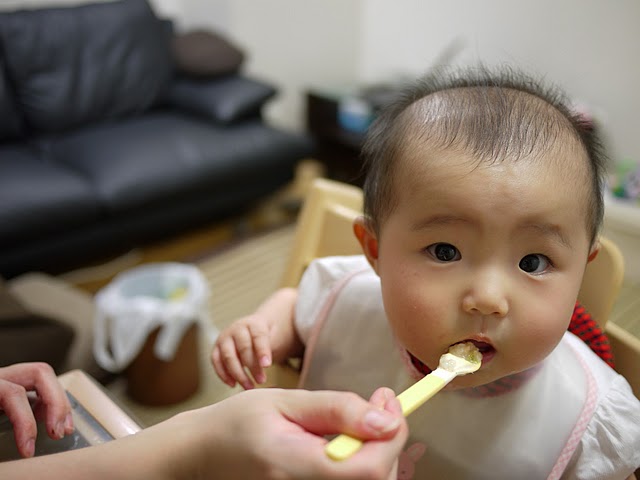 ハルちゃんはなぜか、離乳食をあげている最中、口を拭くと嫌がります。きれいにしてあげてるのになあー。