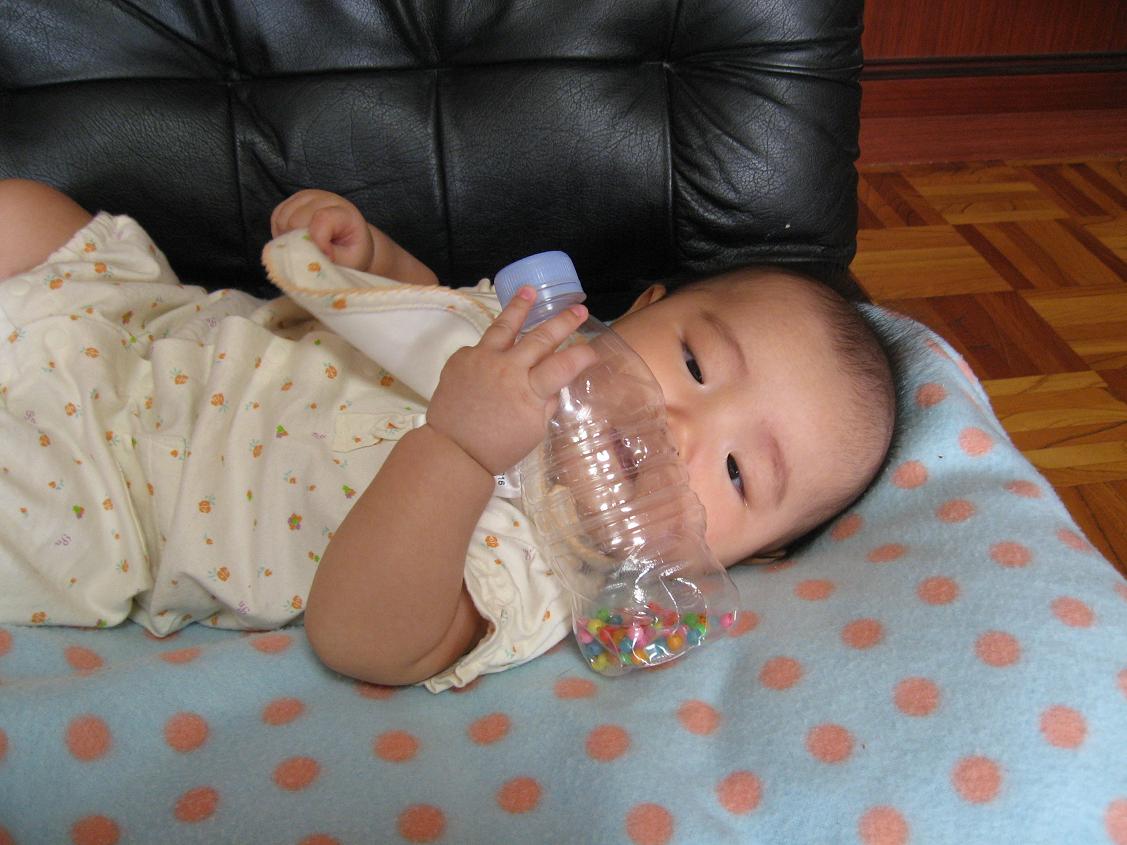 ハルト君の家にはおもちゃがたくさんありましたが、ハルちゃんが一番気に入ったのは、ペットボトルにビーズ玉を入れただけの手作りがらがら。赤ちゃんって、高いものや子供に媚びたデザインのものに限って興味を示さず、安いものやシンプルなものが結構好きだったりしますよね