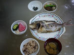右上から時計回りに、炊き合わせ、鯛の塩焼き、はまぐりのお吸い物、お赤飯、香の物、小石