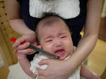 さてさて食べさせようとすると、ハルちゃん、その前からちょっと不機嫌だったのですが、ついに号泣(笑)